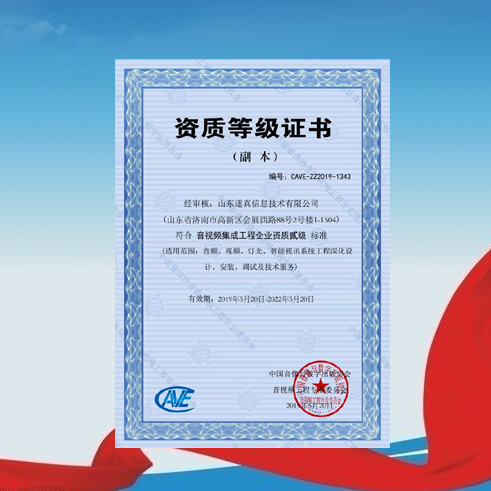 公司獲得中國音像協(xié)會音視頻工程專業(yè)委員會頒發(fā)的《音視頻集成工程企業(yè)資質(zhì)貳級》證書,成為省內(nèi)首批通過該權(quán)威機(jī)構(gòu)認(rèn)證的二級資質(zhì)企業(yè)。